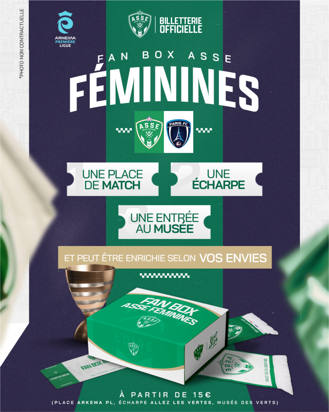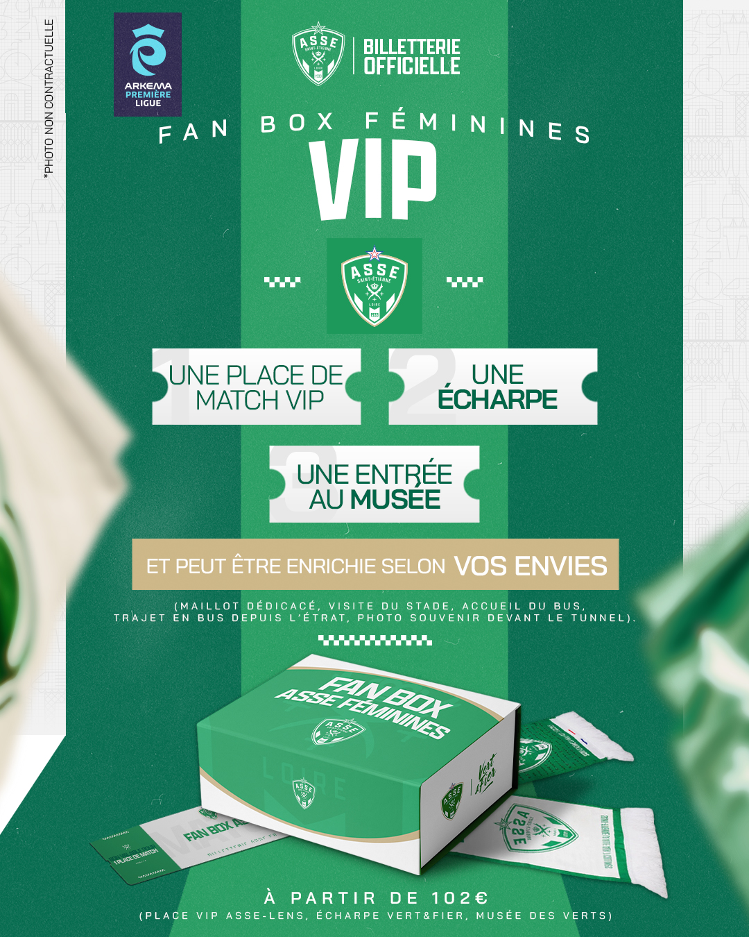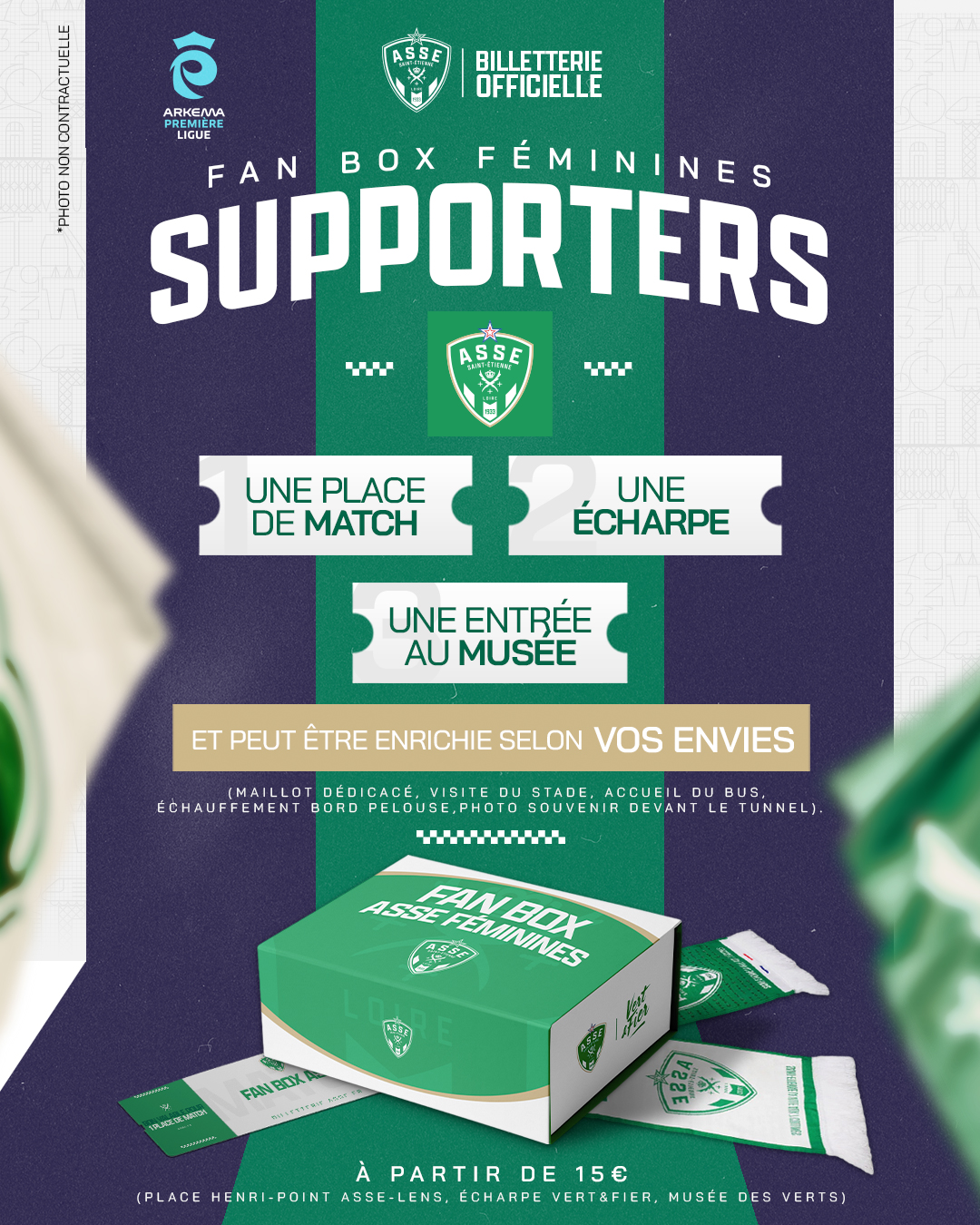 🟢 FAN BOX SUPPORTER : L’essentiel du Peuple Vert Un match inédit à Geoffroy-Guichard mérite une offre inédite ! Vivez le choc ASSE vs LENS au cœur de l'ambiance avec ce pack complet : votre place, l'écharpe officielle et l'accès au Musée des Verts. Le kit parfait pour pousser nos joueuses vers la victoire.