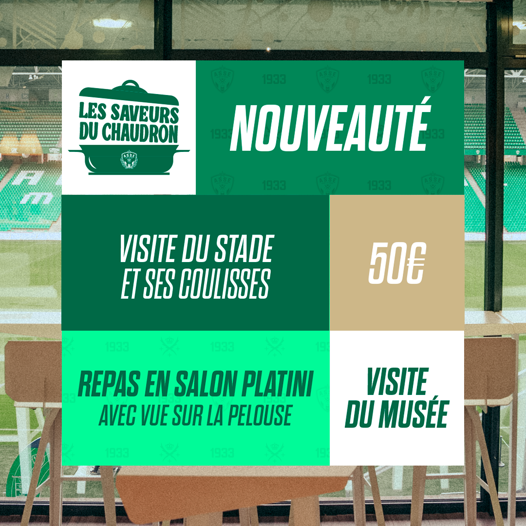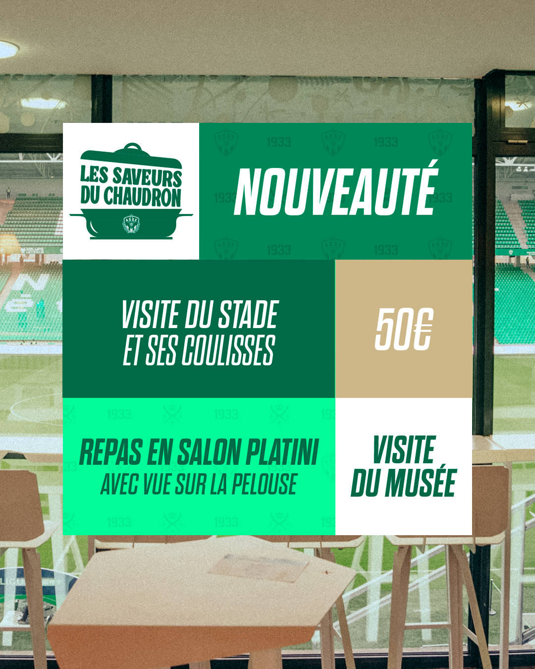 Déjeunez au cœur du Chaudron, découvrez l’envers du décor du stade Geoffroy-Guichard, puis (re)visitez le Musée des Verts quand vous le souhaitez. Une expérience complète, entre terrain, coulisses et histoire du club.